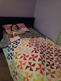 I laid out Abby's pinwheel quilt in Kayli's living room, with her telling me which blocks looked better where. The colors came together better than I could have imagined, and I sewed the blocks to the sashing and into a quilt top in my new condo during late nights. Tears upon tears went into the creation of the quilt. I worried about the effect divorce would have on Abby. I worried that she would blame me or hate me. I worried that she would feel unloved. I hoped and prayed that she would come out the other side stronger and more confident. Finally, I finished the quilting the day she broke her arm. It was wonderful to go home and place a quilt on her as a comfort and hug from mom as she was hurting.