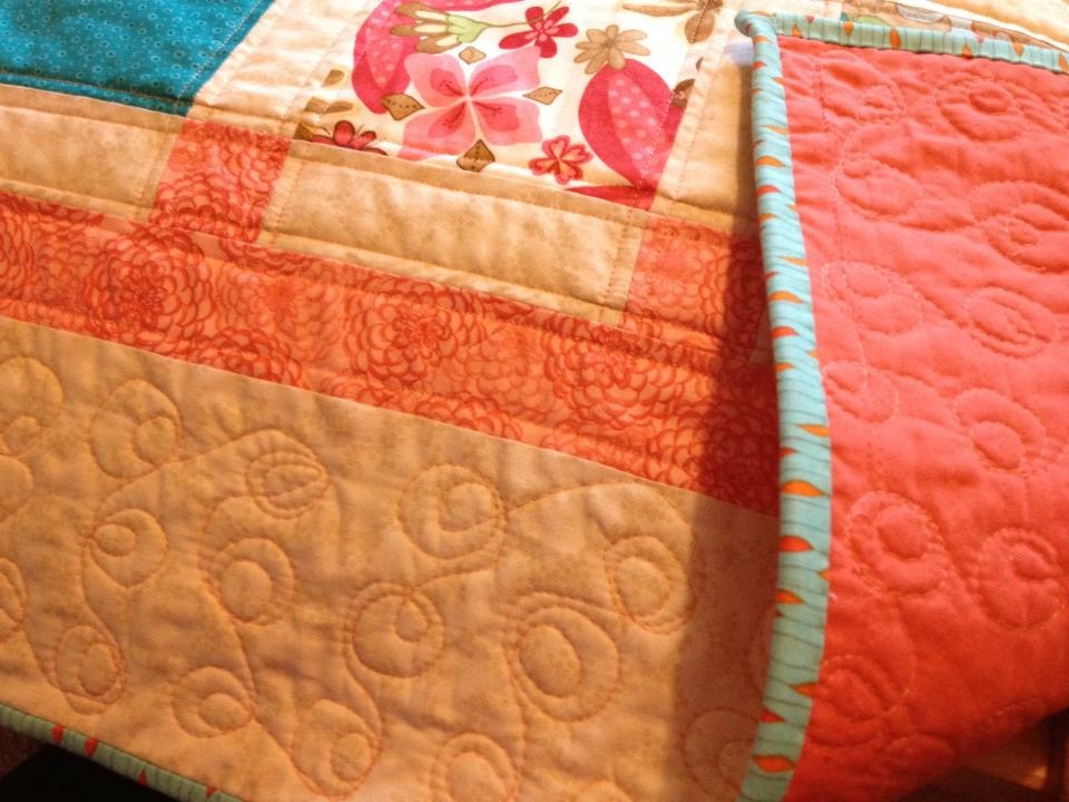 When I started the pink quilt I sent to my mom, it was maybe 2009? I don't even remember. I sewed the quilt top, the seam allowances were slightly too big, and then I got stuck. I didn't know how to finish it, so I stuck it in the basement for a few years. I found it once I had started quilting my kids' throws, and thought about finishing it. The entire project was full of imperfections. The seam allowances were 'off', I couldn't find more fabric to match it, and I thought the whole thing was ugly.
